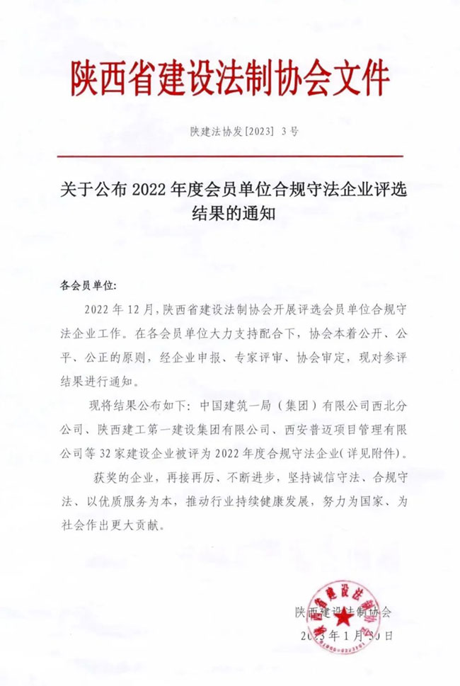 2023年1月30日,陜西建設法制協會公布了《關于2022年度會員單位合規守法企業評選結果的通知》,億誠建設項目管理有限公司榮獲“2022年度合規守法企業”稱號。