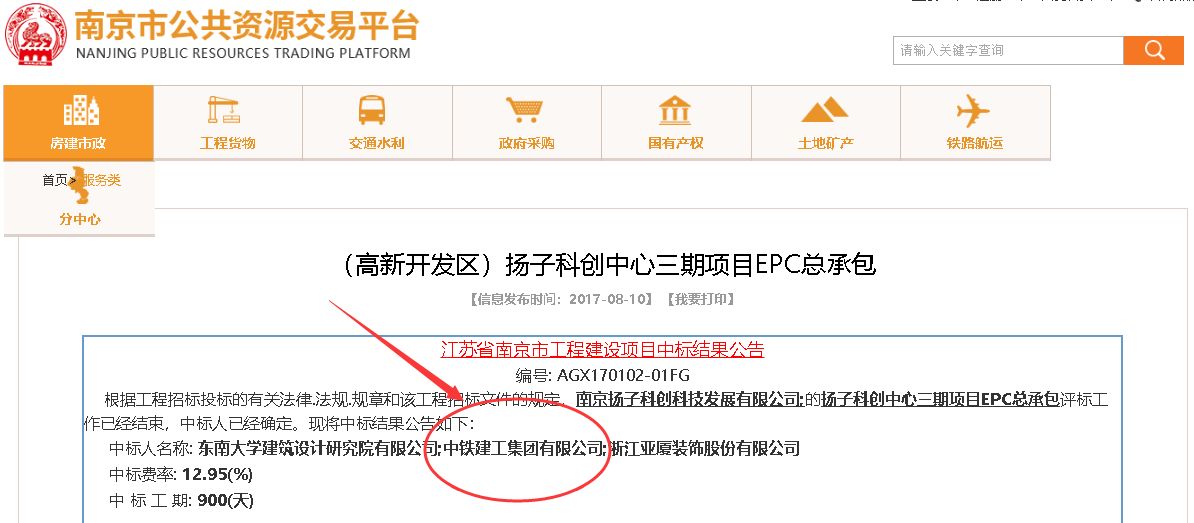 2017年8月10日,南京公共資源交易中心發布公告:東南大學建筑設計院、中鐵建工、亞廈裝飾公司組成的投標聯合體中標;中鐵建工擬派項目經理為張全安。