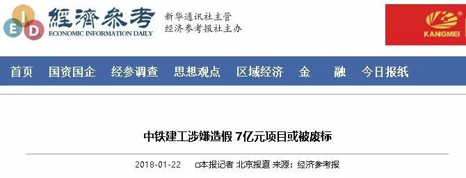 1月22日,《經濟參考報》刊發題為《中鐵建工涉嫌造假 7億元項目或被廢標》的調查文章。